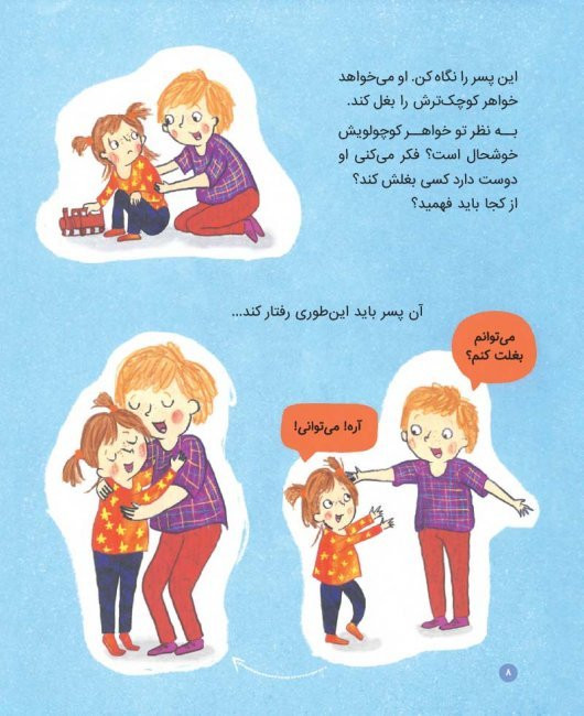 این کتاب با شیوهای صمیمانه و ساده به آموزش همین مفاهیم میپردازد و موقعیتهای متداولی را برای کودک فراهم میکند تا خودش را درگیر همان شرایط ببیند.