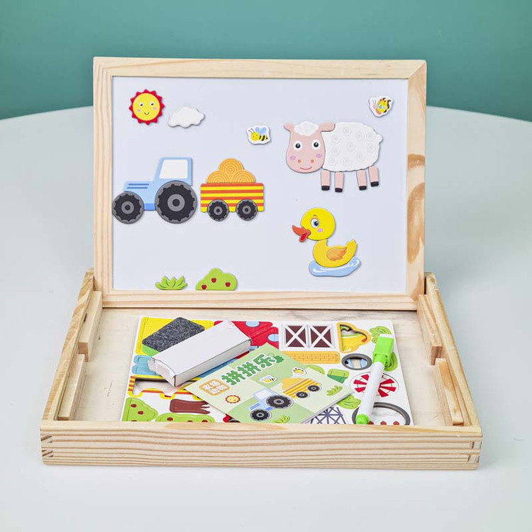 تخته سیاه و وایت برد دو طرفه مگنتی آموزشی، شامل مزایای آموزشی مانند آشنایی کودک شما با حیوانات مزرعه، اشیا و رنگ ها می باشد.