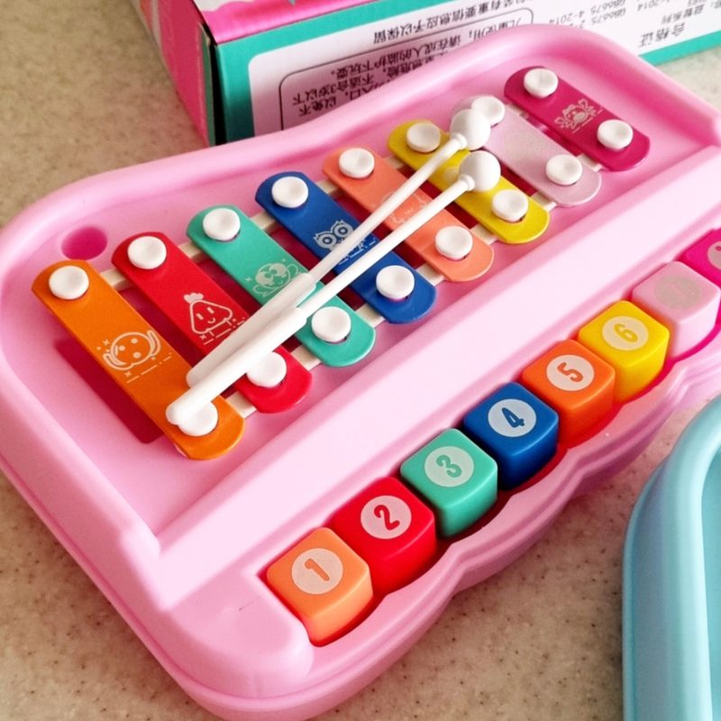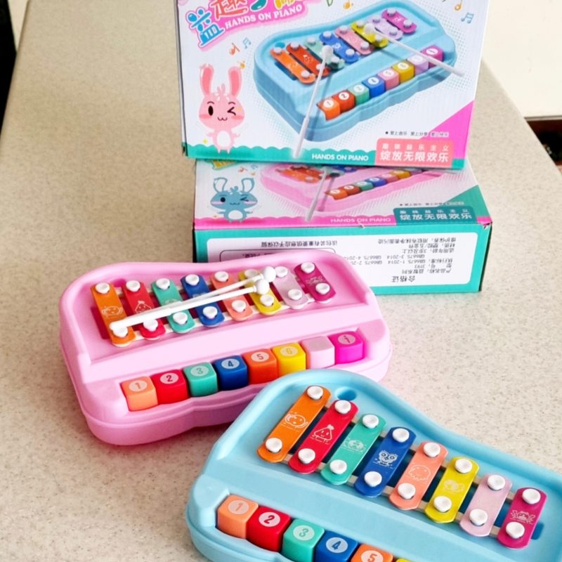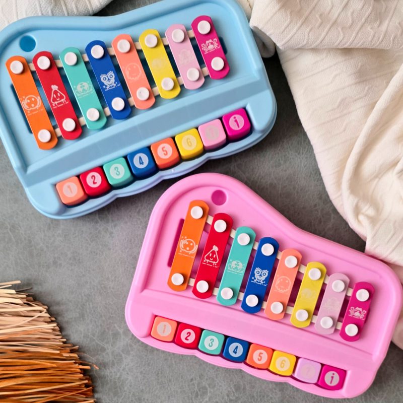 این بلز جذاب هم با دو عدد مضراب که زیر باکس تعبیه شده کار میکنه هم دکمه های پیانو رو وقتی کودک فشار بده نت ها به صدا درمیان.