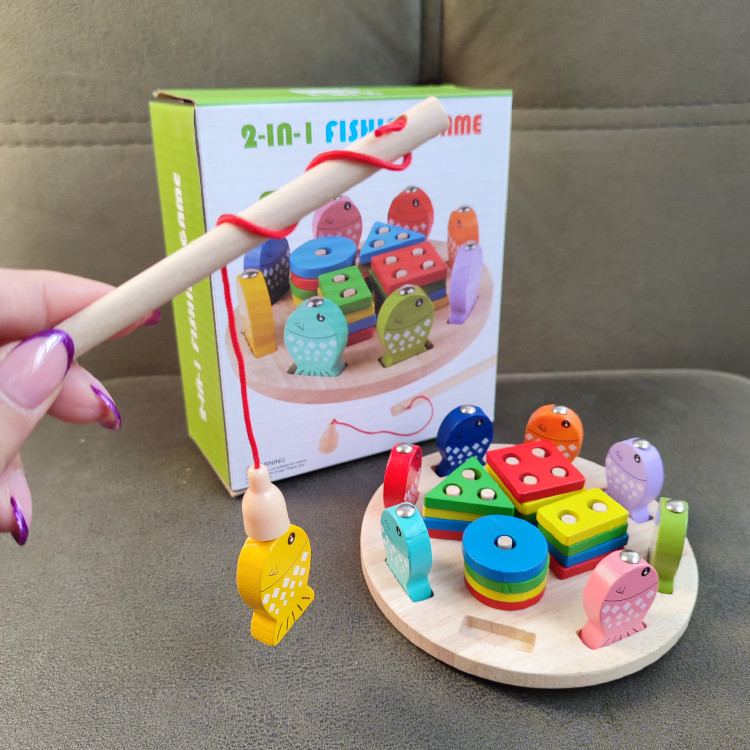 جنس این پایه اشکال تماما چوبیه و دارای یک صفحه پایه چوبی، ۸ عدد ماهی چوبی رنگی و یک عدد قلاب و ۱۶ شکل هندسی(دایره، مثلث، مربع و مستطیل)