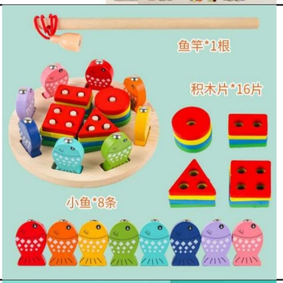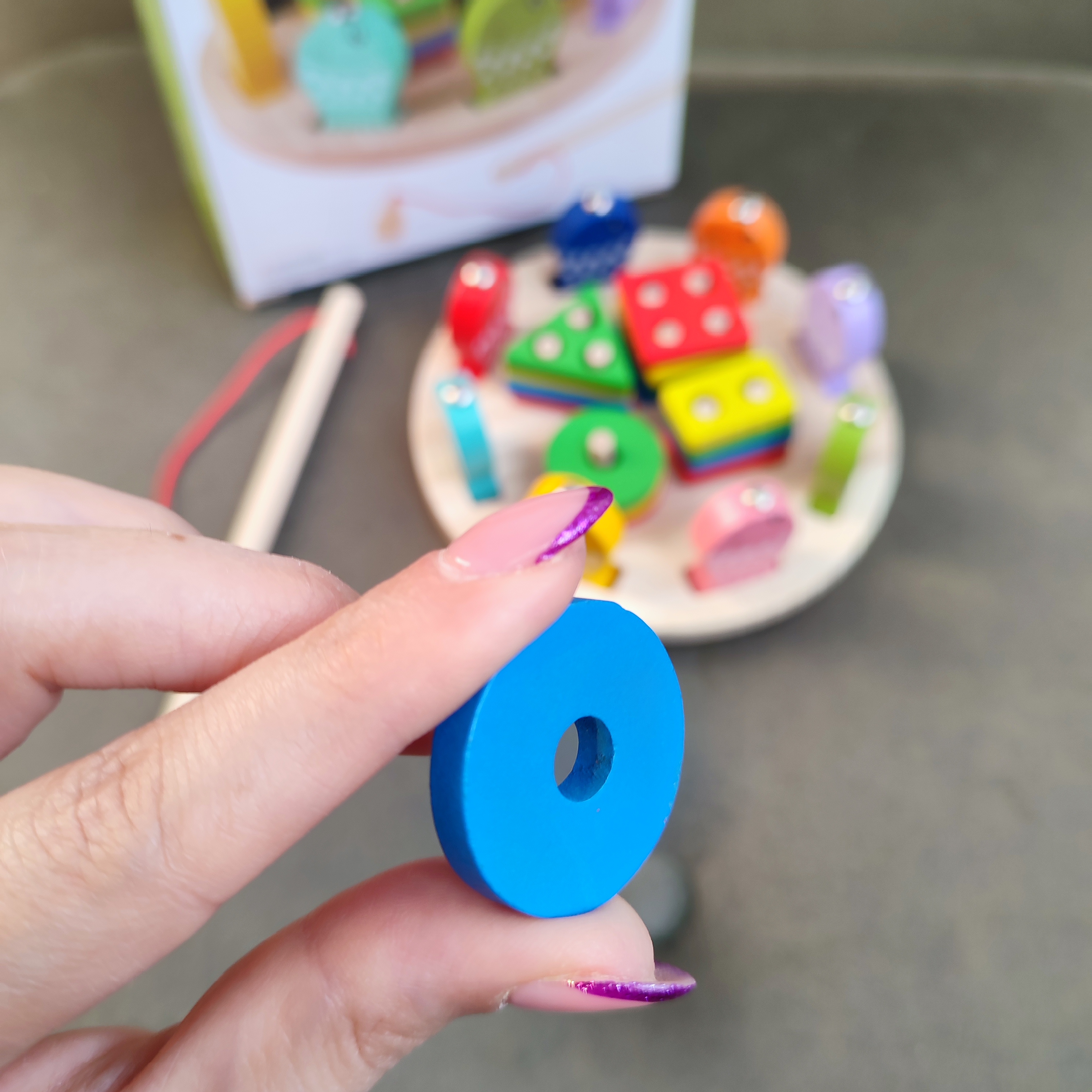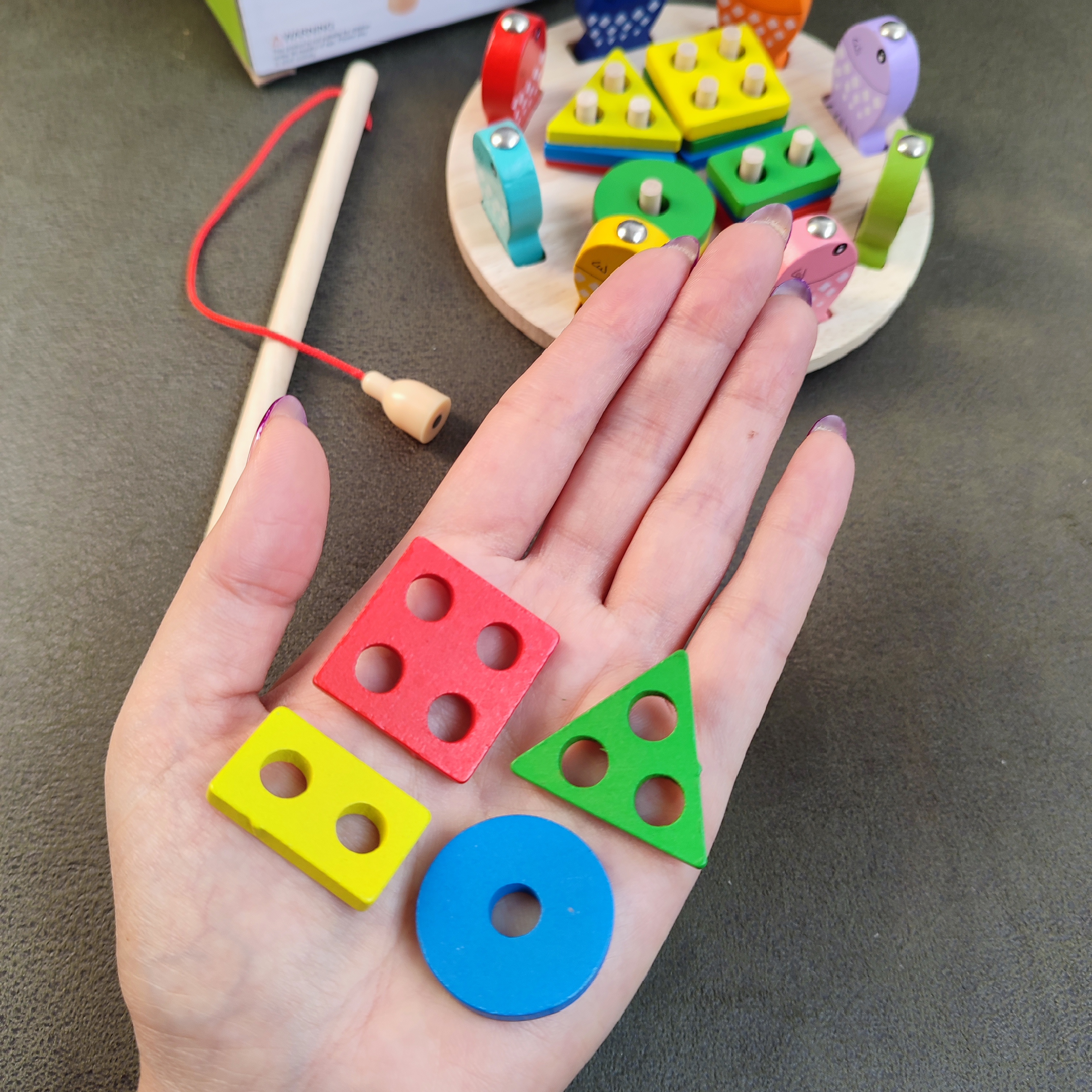 جنس این پایه اشکال تماما چوبیه و دارای یک صفحه پایه چوبی، ۸ عدد ماهی چوبی رنگی و یک عدد قلاب و ۱۶ شکل هندسی(دایره، مثلث، مربع و مستطیل)