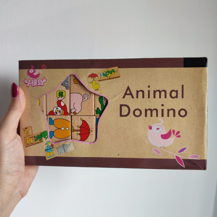 بازی دومینو حیوانات یک بازی چوبی با کیفیت با تصاویر زیبا و جذاب ۱۵ قطعه ای که روی هر قطعه ی آن دو نیمه از یک تصویر طراحی شده است کودکان باید نیمه ی دیگر هر تصویر را پیدا کنند و با کنار هم قرار دادن قطعات در یک راستا دومینو تصویری خود را کامل کنند.