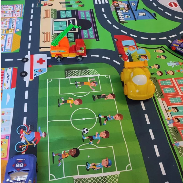 🌝 محتویات جعبه بازی : یک شهر پارچه ای به ابعاد 80×145 سانتی متر بسیار باکیفیت + دو عدد ماشین عقب کش دار(کیفیت ماشین ها در حد متوسط است)