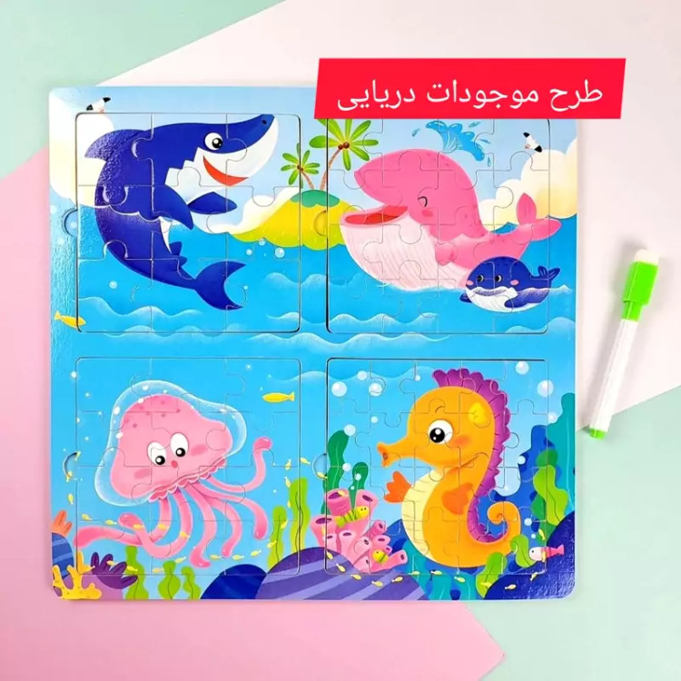 زیر هر پازل، طرحش چاپ شده هر صفحه چوبی شامل4پازل به تکه های زیر است: 9تکه 12تکه 16تکه 20تکه پشت صفحه وایتبردی به همراه یک ماژیک